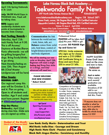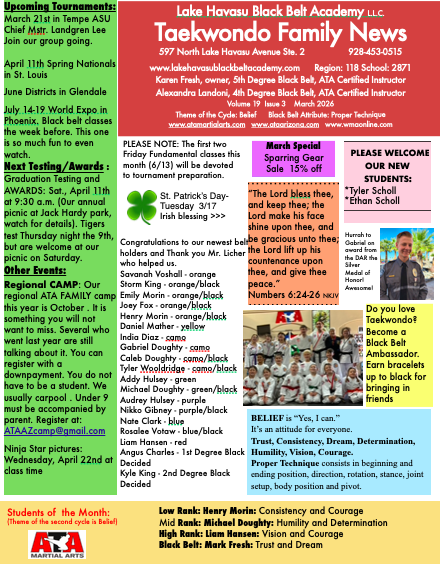 We are a Taekwondo club affiliated with the American Taekwondo Association. In a friendly and fun environment, we teach the Songham style of Taekwondo using various programs such as Tiny Tigers and Karate for Kids and Black Belt Club and Leadership Now. Taekwondo is a Korean martial art that builds self-confidence, self-esteem, physical fitness and mental alertness. Taekwondo is practiced by students age three to one hundred three. Although martial arts are individually practiced, we build social bonds among family and friends. Club owner and ATA certified instructor Karen Fresh is a Fourth Degree Black Belt and has studied and practiced Taekwondo since 1995. Ten of her children, as well as her husband, have attained black belts in ATA Taekwondo. Karen has been a resident of Lake Havasu City since 1985 and has been visiting her family here since 1972. Stop in and try a class at our club located across the highway from the Aquatic/Community Center on Lake Havasu Avenue (349 Suite 106). Turn in at the Lo’s Restaurant sign. Please feel free to contact us on how Lake Havasu Black Belt Academy can help you and your family achieve worthwhile personal goals. And be sure to check out…